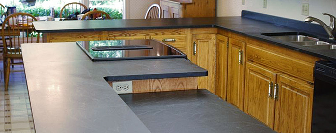 Soapstone is a metamorphic rock composed primarily of talc which over millions of years has been transformed through the geological effects of intense heat and pressure. It is extremely dense and therefore durable and stable. One of the earliest uses of soapstone was for cooking pots because it holds and radiates heat for long periods of time. A hot pot can be placed directly on a soapstone countertop without concern of damaging the surface. Soapstone slabs are great for use as countertops or as fireplace surrounds. Since it is composed primarily of talc, the acids in foods used for everyday cooking will not etch or stain the surface. Soapstone is relatively soft and can scratch, so using a cutting board is required. The patina of the stone can be enhanced by using mineral oil.