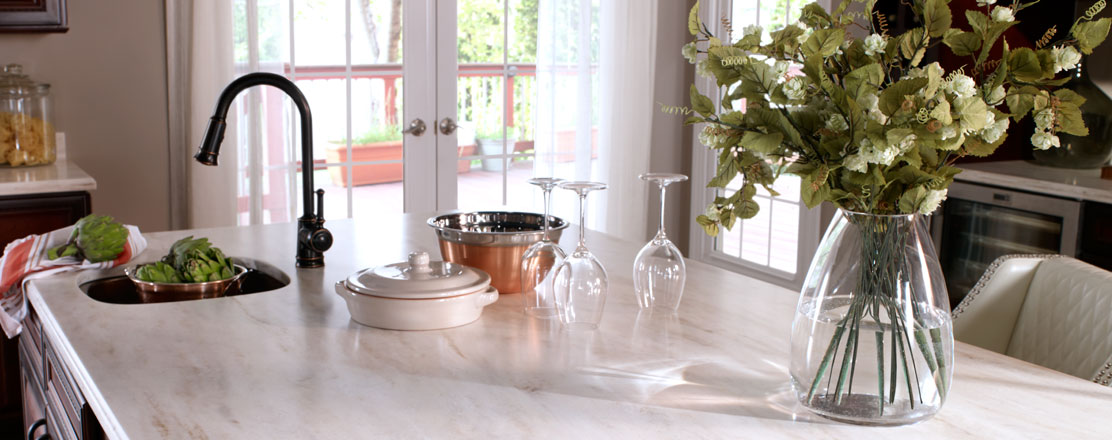 Created by DuPont, Corian® is a 100% acrylic product that is the perfect medium for unique and beautiful designs. Corian® is available in over 130 colors. It is the ideal surface for kitchen countertops and bathroom vanities. It can be thermoformed to created custom shower pans and makes easy to clean bath and shower surrounds. When integrated with Corian® sinks and coved backsplash the entire countertop appears to flow seamlessly through the entire kitchen or bath. Every Corian® countertop can be customized with a wide variety of edge profiles.